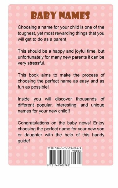 BABY NAMES Choosing the perfect name for your new son or daughter can be an extremely excited time, but also a stressful one for many new parents. Luckily, with the help of this book, you will have no trouble in finding the right name to choose, and all of the stress will be removed! Inside you will be provided with a massive range of popular and unique names to choose from. This book also includes the meanings of all names, so that you can choose something that is truly meaningful to you. At over 180 pages long, this book is the only guide you'll ever need to help you choose the perfect name for your baby! Here Is What's Included... Popular Boys Names Popular Girls Names Unique Boys Names Unique Girls Names Unisex Names Famous Names The Meanings of all Names Much, Much More!