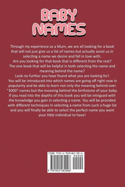 Through my experience as a Mum, we are all looking for a book that will not just give us a list of names but actually assist us in selecting a name we desire and fall in love with.Are you looking for that book that is different from the rest? The one book that will be helpful in both selecting the name and meaning behind the name? Look no further you have found what you are looking for!Learn the history in what is behind a name and why we are named! You will find the information enclosed quite intriguing. I have written for your convenience guidelines and truly helpful techniques in selecting a name and by using all of my techniques I used in my experiences you will find the name your searching for a lot faster than aimlessly staring at names on an internet site or another book. You will be introduced into which names are going off right now in popularity and be able to learn not only the meaning behind over "3000" names but the meaning behind the birthstone of your baby. If you read into the depths of this book you will be intrigued with the knowledge you gain in selecting a name. You will be provided with different techniques in selecting a name from such a huge list and you will finally be able to select the perfect name you want your little individual to have!