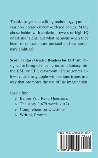 Thanks to genetic editing technology, parents can now create custom-ordered babies. Many chose babies with athletic prowess or high IQ or artistic talent, but what happens when they learn to unlock more unusual and extraordinary abilities? Sci-Fi Fantasy Graded Readers for ELT are designed to bring science fiction and fantasy into the ESL or EFL classroom. These genres allow readers to grapple with serious issues in a way that promotes the use of the imagination. Inside find: Before You Read questions The story (Words / Level) Comprehension Questions Writing Prompt