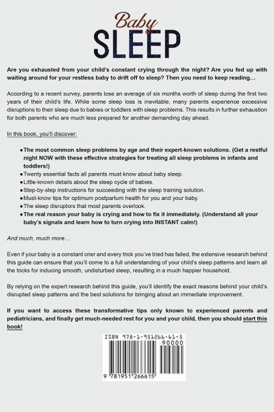 Are you exhausted from your child’s constant crying through the night? Are you fed up with waiting around for your restless baby to drift off to sleep? Then you need to keep reading… According to a recent survey, parents lose an average of six months worth of sleep during the first two years of their child’s life. While some sleep loss is inevitable, many parents experience excessive disruptions to their sleep due to babies or toddlers with sleep problems. This results in further exhaustion for both parents who are much less prepared for another demanding day ahead. In this book, you’ll discover: The most common sleep problems by age and their expert-known solutions. (Get a restful night NOW with these effective strategies for treating all sleep problems in infants and toddlers!) Twenty essential facts all parents must know about baby sleep. Little-known details about the sleep cycle of babies. Step-by-step instructions for succeeding with the sleep training solution. Must-know tips for optimum postpartum health for you and your baby. The sleep disruptors that most parents overlook. The real reason your baby is crying and how to fix it immediately. (Understand all your baby’s signals and learn how to turn crying into INSTANT calm!) And much, much more… Even if your baby is a constant crier and every trick you’ve tried has failed, the extensive research behind this guide can ensure that you’ll come to a full understanding of your child’s sleep patterns and learn all the tricks for inducing smooth, undisturbed sleep, resulting in a much happier household. By relying on the expert research behind this guide, you’ll identify the exact reasons behind your child’s disrupted sleep patterns and the best solutions for bringing about an immediate improvement. If you want to access these transformative tips only known to experienced parents and pediatricians, and finally get much-needed rest for you and your child, then you should start this book!