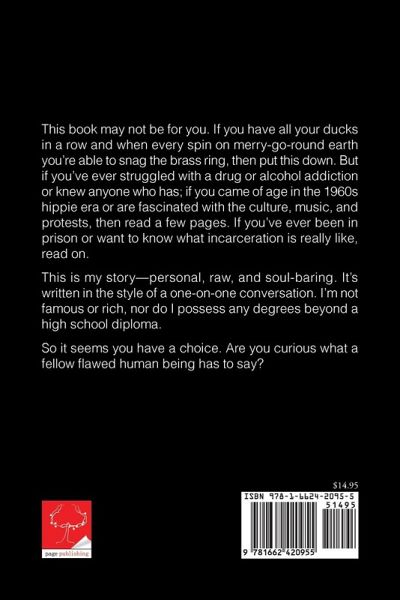 This book may not be for you. If you have all your ducks in a row and when every spin on merry-go-round earth you're able to snag the brass ring, then put this down. But if you've ever struggled with a drug or alcohol addiction or knew anyone who has; if you came of age in the 1960s hippie era or are fascinated with the culture, music, and protests, then read a few pages. If you've ever been in prison or want to know what incarceration is really like, read on. This is my story-personal, raw, and soul-baring. It's written in the style of a one-on-one conversation. I'm not famous or rich, nor do I possess any degrees beyond a high school diploma. So it seems you have a choice. Are you curious what a fellow flawed human being has to say?