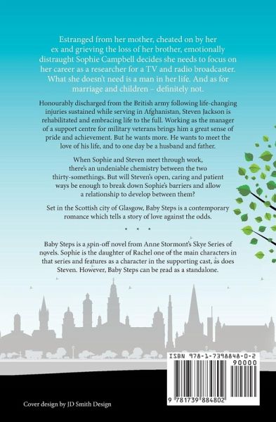 Sparks fly in this love-against-the-odds romance Estranged from her mother, cheated on by her ex and grieving the loss of her brother, emotionally distraught Sophie Campbell decides she needs to focus on her career as a researcher for a TV and radio broadcaster. What she doesn't need is a man in her life. And as for marriage and children - definitely not. Honourably discharged from the British army following life-changing injuries sustained while serving in Afghanistan, Steven Jackson is rehabilitated and embracing life to the full. Working as the manager of a support centre for military veterans brings him a great sense of pride and achievement. But he wants more. He wants to meet the love of his life, and to one day be a husband and father. When Sophie and Steven meet through work, there's an undeniable chemistry between the two thirty-somethings. But will Steven's open, caring and patient ways be enough to break down Sophie's barriers and allow a relationship to develop between them? Set in the Scottish city of Glasgow, Baby Steps is a contemporary romance which tells a story of love against the odds. ************** Baby Steps is a spin-off novel from Anne Stormont's Skye Series of novels. Sophie is the daughter of Rachel one of the main characters in that series and features as a character in the supporting cast, as does Steven. However, Baby Steps can be read as a standalone.