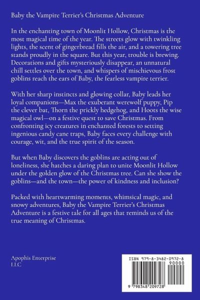 Baby the Vampire Terrier's Christmas Adventure In the enchanting town of Moonlit Hollow, Christmas is the most magical time of the year. The streets glow with twinkling lights, the scent of gingerbread fills the air, and a towering tree stands proudly in the square. But this year, trouble is brewing. Decorations and gifts mysteriously disappear, an unnatural chill settles over the town, and whispers of mischievous frost goblins reach the ears of Baby, the fearless vampire terrier. With her sharp instincts and glowing collar, Baby leads her loyal companions-Max the exuberant werewolf puppy, Pip the clever bat, Thorn the prickly hedgehog, and Hoots the wise magical owl-on a festive quest to save Christmas. From confronting icy creatures in enchanted forests to setting ingenious candy cane traps, Baby faces every challenge with courage, wit, and the true spirit of the season. But when Baby discovers the goblins are acting out of loneliness, she hatches a daring plan to unite Moonlit Hollow under the golden glow of the Christmas tree. Can she show the goblins-and the town-the power of kindness and inclusion? Packed with heartwarming moments, whimsical magic, and snowy adventures, Baby the Vampire Terrier's Christmas Adventure is a festive tale for all ages that reminds us of the true meaning of Christmas.