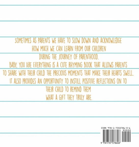 Description Sometimes as parents we forget to be a friend to our child, forget how much we can learn from our children or simply lack telling our children how much they inspire us. Baby, You Are Everything is a cute little rhyming book to share with your child how you feel, let's your child know you are there for them, and instills positive reflections to remind them what a gift they truly are. This book is a reminder to slow down, enjoy the moments, remind our child or children while we may be parents we can still be a friend , someone they can trust and someone who values their potential and knows that they are EVERYTHING and MORE!