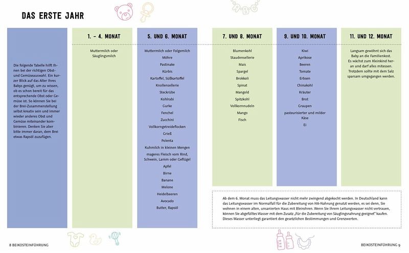 Direkt vorn in diesem Buch erhält man gleich einmal die wichtigsten Informationen rund um die Beikosteinführung sowie einen Drei-Stufenplan hinsichtlich der Breifütterung. Darauf folgt eine Übersicht über die verschiedenen Lebensmittel und ab wann man diese dem Baby zu essen geben sollte, was ich wirklich sehr praktisch finde. Anschließend folgt ein Hebammen-Special auf vier Doppelseiten, hier werden verschiedene Fragen rund um das Thema Brei näher erläutert. Dann kommen die Rezepte, die so eingeteilt sind, dass man welche für ab dem 5., 6. 8. sowie 10. Monat findet, danach noch Mama-Baby-Rezepte.