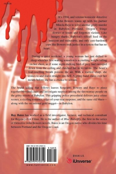 It's 1994, and veteran homicide detective John Bowers teams up with his partner Minola Raye to solve another grisly murder in Babylon-Portland, Oregon's fringe district of losers and forgotten victims. Like hungry sharks, Babylon's riffraff feed on the innocent and vulnerable, and only case-hardened cops like Bowers seek justice in a system that has no heart. During a quiet weekend, a young woman has just drifted to sleep when her first waking sensation is a crushing weight falling on her chest, as if some night-stalking bird of prey had swooped down from the ceiling and clutched her in its talons. The beast's foul-smelling breath poisons the air. With a startled chirp, she comes to and stares straight into hell. A grimy hand slams over her mouth before she has a chance to scream. The brutal killing that follows leaves Sergeants Bowers and Raye to piece together bloodied clues and investigate suspects among the throwaway people on the gritty streets of Babylon. This gripping police procedural delivers juicy crime scenes, a sizzling romance, edge-of-your-seat suspense, and the same old blues-along with the occasional gold nugget-in Babylon.