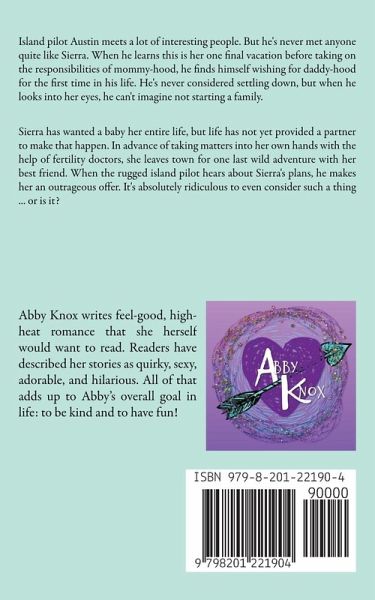 Island pilot Austin meets a lot of interesting people. But he's never met anyone quite like Sierra. When he learns this is her one final vacation before taking on the responsibilities of mommy-hood, he finds himself wishing for daddy-hood for the first time in his life. He's never considered settling down, but when he looks into her eyes, he can't imagine not starting a family. Sierra has wanted a baby her entire life, but life has not yet provided a partner to make that happen. In advance of taking matters into her own hands with the help of fertility doctors, she leaves town for one last wild adventure with her best friend. When the rugged island pilot hears about Sierra's plans, he makes her an outrageous offer. It's absolutely ridiculous to even consider such a thing ... or is it?