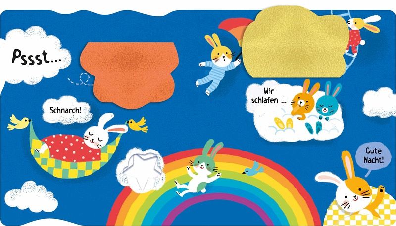 Hui! Schiebe den Elefanten auf der Schaukel an. Schau unter der Klappe nach, ob die Hasen schon schlafen. Siehst du die glitzernden Sterne? Klappe, Schieber, Gucklöcher und Fühlelemente in diesem kontrastreichen Buch fördern spielerisch die Feinmotorik.