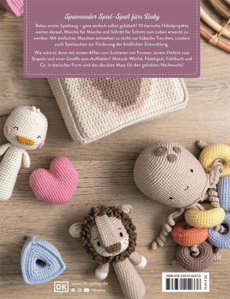 Wolle und Häkelnadel auspacken und loslegen: Dieses Häkelbuch enthält 10 Anleitungen für schnuckelige Häkeltiere, die nicht nur niedlich aussehen, sondern auch pädagogisch wertvoll sind. Ob ein Affe zum Sortieren von Formen, ein Elefant zum Stapeln oder ein Löwe als Rassel: Hier wird alles mit einfachen Maschen selbst gehäkelt! Jedes Häkelspielzeug enthält ein interaktives und pädagogisches Element, das Babys und Kleinkinder in ihrer Entwicklung unterstützt. Die Häkelanleitungen sind Schritt für Schritt beschrieben und bebildert - so finden alle Häkelbegeisterten das passende Spielzeug für den Nachwuchs!