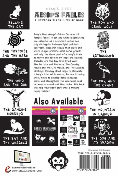 Baby's First Aesop's Fables features 22 famous fables. Black and white illustrations are essential as a newborn's retina can only distinguish between light and dark contrasts. Research shows that black and white images promote optic nerve growth and help the visual part of a baby's brain to thrive and develop by leaps and bounds. Included are The Boy Who Cried Wolf, The Tortoise and the Hare, The Country Mouse and the City Mouse, and The Dancing Monkeys. Reading aloud helps to stimulate a baby's interest in sounds, fosters listening skills, helps to develop early language skills, and strengthens the emotional bond between a parent and their baby. This book will help your baby grow into a thriving happy toddler.