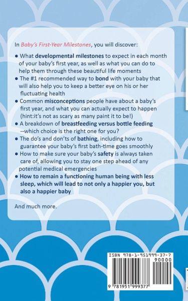 Take the guesswork out of parenting and become a pro, even before your baby is born... Are you an expecting parent who worries you won't be able to live up to the expectations of what it means to be a good parent, believing you will fail the child in some way? Do you fear you might accidentally hurt the baby, whether it be by harming its soft spot, not knowing how to properly support its neck, or something entirely different? Are you afraid your baby's development isn't measuring up with others at the same age, signifying some sort of abnormality? Put the constant worrying to an end, and let's set things straight. Feeling confused or overwhelmed is completely normal for new or expecting parents, so you can rest assured knowing you're not alone. Every prospective parent has his or her endless list of questions and worries before jumping into the world of babies, but what matters most is that you are prepared. In order to feel certain in your parental decision-making skills and silence the doubting voices in your head, the first step is to fill your head with all the baby knowledge there is to know--the good and the bad. In Baby's First-Year Milestones, you will discover: What developmental milestones to expect in each month of your baby's first year, as well as what you can do to help them through these beautiful life moments The #1 recommended way to bond with your baby that will also help you to keep a better eye on his or her fluctuating health Common misconceptions people have about a baby's first year, and what you can actually expect to happen (hint: it's not as scary as many paints it to be!) A breakdown of breastfeeding versus bottle feeding--which choice is the right one for you? The do's and don'ts of bathing, including how to guarantee your baby's first bath-time goes smoothly How to remain a functioning human being with less sleep, which will lead to not only a happier you, but also a happier baby And much more. If you're already on your second child and have experienced the workings of your baby's first year, there's always room for improvement and additional knowledge. You most likely had plenty of doubts when you took your first steps as a parent, but now with previous training supplemented by extra expertise, you will be able to take on this new bundle of joy with confidence and enthusiasm. Help take the unexpected out of parenting--caring for and enjoying the company of your newborn baby won't be your focus if you're constantly worrying about the worst-case scenario. Do yourself a favor and take the time to understand exactly what it is you can expect so you can be in the moment. Learn the coping techniques necessary now before you're too stressed to figure it out when you actually need them. By being ahead of the game, you'll know just how you should handle tough situations without hesitation. You don't get a second chance on your baby's first year. Learn the ropes now, and your future self will thank you. If you want to be prepared for your baby's sacred first year of life and discover how to be the perfect parent, then scroll up and click the "Add to Cart" button right now.