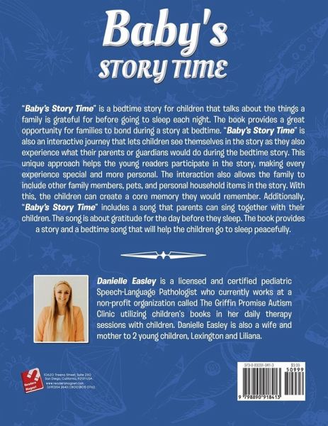 "Baby's Story Time" is a bedtime story for children that talks about the things a family is grateful for before going to sleep each night. The book provides a great opportunity for families to bond during a story at bedtime. "Baby's Story Time" is also an interactive journey that lets children see themselves in the story as they also experience what their parents or guardians would do during the bedtime story. This unique approach helps the young readers participate in the story, making every experience special and more personal. The interaction also allows the family to include other family members, pets, and personal household items in the story. With this, the children can create a core memory they would remember. Additionally, "Baby's Story Time" includes a song that parents can sing together with their children. The song is about gratitude for the day before they sleep. The book provides a story and a bedtime song that will help the children go to sleep peacefully.