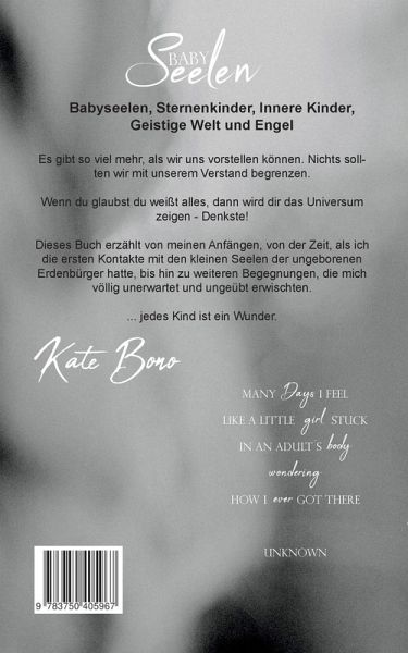Babyseelen, Sternenkinder, Innere Kinder, Geistige Welt und Engel Es gibt so viel mehr, als wir uns vorstellen können. Nichts sollten wir mit unserem Verstand begrenzen.Wenn du glaubst du weißt alles, dann wird dir das Universum zeigen - Denkste!Dieses Buch erzählt von meinen Anfängen, von der Zeit, als ich die ersten Kontakte mit den kleinen Seelen der ungeborenen Erdenbürger hatte, bis hin zu weiteren Begegnungen, die mich völlig unerwartet und ungeübt erwischten....jedes Kind ist ein Wunder.Kate BonoMany days I feel like a little girl stuck in an adult´s bodywonderinghow I ever got thereunknown