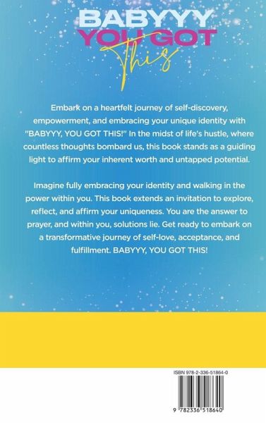 Embark on a heartfelt journey of self-discovery, empowerment, and embracing your unique identity with "BABYYY, YOU GOT THIS!" In the midst of life's hustle, where countless thoughts bombard us, this book stands as a guiding light to affirm your inherent worth and untapped potential. Imagine fully embracing your identity and walking in the power within you. This book extends an invitation to explore, reflect, and affirm your uniqueness. You are the answer to prayer, and within you, solutions lie. Get ready to embark on a transformative journey of self-love, acceptance, and fulfillment. BABYYY, YOU GOT THIS!…mehr