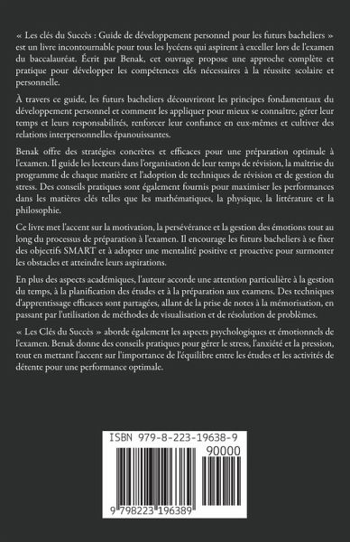 Titre du livre : ¿Les clés du Succès : Guide de développement personnel pour les futurs bacheliers¿ ¿Les clés du Succès : Guide de développement personnel pour les futurs bacheliers¿ est un livre incontournable pour tous les lycéens qui aspirent à exceller lors de l'examen du baccalauréat. Écrit par Benak, cet ouvrage propose une approche complète et pratique pour développer les compétences clés nécessaires à la réussite scolaire et personnelle. À travers ce guide, les futurs bacheliers découvriront les principes fondamentaux du développement personnel et comment les appliquer pour mieux se connaître, gérer leur temps et leurs responsabilités, renforcer leur confiance en eux-mêmes et cultiver des relations interpersonnelles épanouissantes. Benak offre des stratégies concrètes et efficaces pour une préparation optimale à l'examen. Il guide les lecteurs dans l'organisation de leur temps de révision, la maîtrise du programme de chaque matière et l'adoption de techniques de révision et de gestion du stress. Des conseils pratiques sont également fournis pour maximiser les performances dans les matières clés telles que les mathématiques, la physique, la littérature et la philosophie. Ce livre met l'accent sur la motivation, la persévérance et la gestion des émotions tout au long du processus de préparation à l'examen. Il encourage les futurs bacheliers à se fixer des objectifs SMART et à adopter une mentalité positive et proactive pour surmonter les obstacles et atteindre leurs aspirations. En plus des aspects académiques, l'auteur accorde une attention particulière à la gestion du temps, à la planification des études et à la préparation aux examens. Des techniques d'apprentissage efficaces sont partagées, allant de la prise de notes à la mémorisation, en passant par l'utilisation de méthodes de visualisation et de résolution de problèmes. ¿Les Clés du Succès aborde également les aspects psychologiques et émotionnels de l'examen. Benak donne des conseils pratiques pour gérer le stress, l'anxiété et la pression, tout en mettant l'accent sur l'importance de l'équilibre entre les études et les activités de détente pour une performance optimale. La clarté de l'écriture de Benak et son approche dynamique et engageante font de ce livre un outil accessible et motivant. Des exemples concrets et des témoignages de réussite viennent illustrer les concepts abordés, offrant ainsi une source d'inspiration pour les lecteurs. ¿Les clés du Succès constitue un compagnon indispensable pour les lycéens qui souhaitent se préparer de manière optimale à l'examen du baccalauréat. Ce livre offre des outils pratiques, des conseils stratégiques et une approche équilibrée pour guider les lecteurs vers le succès académique et personnel. Disponible sur les plateformes d'édition et recommandé par les maisons d'édition, il représente une ressource précieuse pour tous ceux qui aspirent à atteindre des résultats exceptionnels et à se préparer à une vie épanouissante.