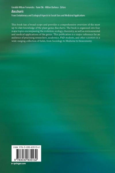 This book has a broad scope and provides a comprehensive overview of the most up-to-date knowledge of the plant genus Baccharis . The book is organized into four major topics encompassing the evolution, ecology, chemistry, as well as environmental and medical applications of the genus. This publication is a major reference for an audience of practising researchers, academics, PhD students, and other scientists in a wide-ranging collection of fields, from Sociology to Medicine to bioeconomy.