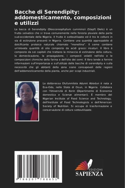 La bacca di Serendipity (Dioscoreophyllum cumminsii (Stapf) Diels) è un frutto selvatico che si trova comunemente nella foresta pluviale della parte sud-occidentale della Nigeria. Il frutto è sottoutilizzato ed è tra le colture in via di estinzione presenti in Nigeria. Contiene una quantità apprezzabile di dolcificante proteico naturale chiamato "monellina". Il seme contiene un'elevata quantità di olio composto da acidi grassi insaturi. Il libro è composto da sei capitoli che trattano la minaccia di estinzione della coltura, la domesticazione, la propagazione, i composti volatili nell'olio e le composizioni chimiche della farina e dell'olio dei semi. Il libro tende a fornire informazioni sull'importanza e sull'utilizzo delle bacche di serendipity e sulla necessità che gli abitanti della zona siano consapevoli delle ragioni dell'addomesticamento della pianta, anche per scopi industriali.
