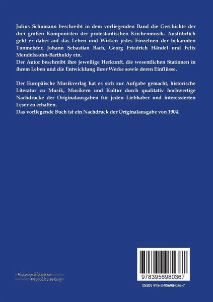 Julius Schumann beschreibt in dem vorliegenden Band die Geschichte der drei großen Komponisten der protestantischen Kirchenmusik. Ausführlich geht er dabei auf das Leben und Wirken jedes Einzelnen der bekannten Tonmeister, Johann Sebastian Bach, Georg Friedrich Händel und Felix Mendelssohn-Bartholdy ein.