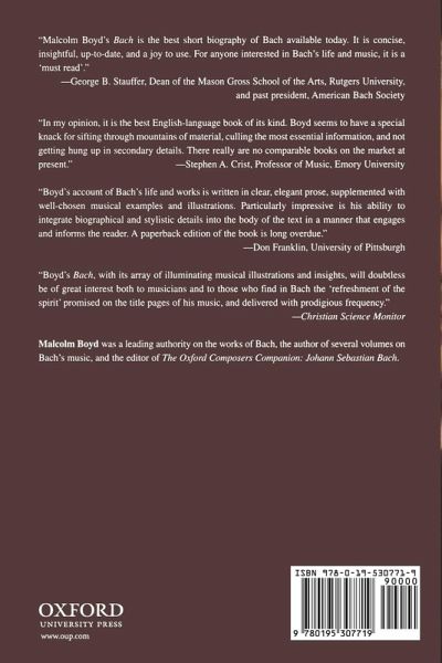 Published in its first edition in 1983, Boyd's treatment of this canonical composer is essential reading for students, scholars, and everyone interested in Baroque music. In this third edition, biographical chapters alternate with commentary on the works, to demonstrate how the circumstances of Bach's life helped to shape the music he wrote at various periods. We follow Bach as he travels from Arnstadt and Muhlhausen to Weimar, Cothen, and finally Leipzig, these journeys alternating with insightful discussions of the great composer's organ and orchestral compositions. As well as presenting a rounded picture of Bach, his music, and his posthumous reputation and influence, Malcolm Boyd considers the sometimes controversial topics of "parody" and arrangement, number symbolism, and the style and meaning of Bach's late works. Recent theories on the constitution of Bach's performing forces at Leipzig are also present. The text and the appendixes (which include a chronology, personalia, bibliography, and a complete catalogue of Bach's works) were thoroughly revised in this edition to take account of more recent research undertaken by Bach scholars, including the gold mine of new information uncovered in the former USSR.