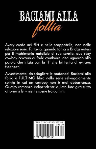 Avery crede nei flirt e nelle scappatelle, non nelle relazioni serie. Tuttavia, quando torna a Bridgewaters per il matrimonio natalizio di sua sorella, due sexy cowboy cercano di farle cambiare idea riguardo alla parola che inizia con la "f" che lei tenta di evitare: fidanzati. Avvertimento: da sciogliere le mutande! Baciami alla follia è l'ULTIMO libro nella serie selvaggiamente spinta in cui un cowboy non è mai abbastanza. Questo romanzo indipendente a lieto fine gira tutto attorno a lei - niente scene tra uomini. Non proprio un harem al contrario, ma un cowboy non è mai abbastanza.
