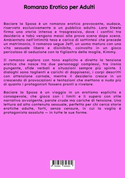 Baciare la Sposa è un romanzo erotico provocante, audace, riservato esclusivamente a un pubblico adulto. Lara Steele firma una storia intensa e trasgressiva, dove i confini tra desiderio e tabù vengono messi alla prova scena dopo scena. Ambientato nell'intimità tesa e carica di sottintesi che precede un matrimonio, il romanzo segue Jeff, un uomo maturo con una vita sessuale libera e disinibita, coinvolto in un gioco pericoloso di seduzione con la figliastra della moglie, Kimmy.Il romanzo esplora con tono esplicito e diretto la tensione erotica che nasce tra due personaggi complessi, tra ironia pungente, sfide verbali e situazioni sempre più spinte. I dialoghi sono taglienti e carichi di doppisensi, i corpi descritti con attenzione carnale, mentre il desiderio cresce in un crescendo di provocazioni e tentazioni che mettono a nudo più di quanto i protagonisti fossero pronti a rivelare.Baciare la Sposa è un viaggio in un erotismo esplicito e consapevole, che gioca con i limiti e li supera con stile narrativo avvolgente, parole crude ma cariche di tensione. Una lettura ad alto contenuto sessuale, perfetta per chi cerca storie erotiche adulte, forti, senza censure, in cui la voglia è protagonista assoluta - in tutte le sue forme.
