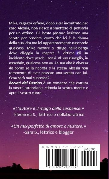 Mike, ragazzo orfano, dopo aver incontrato per caso Alessia, non riesce a smettere di pensarla per un attimo. Gli basta passare insieme una serata per rendersi conto che lei è la donna della sua vita ma lei apparentemente nasconde qualcosa. Mike mentre si dirige nell'albergo dove alloggia la ragazza è vittima di un incidente dove perde i sensi. Al suo risveglio, in ospedale, qualcosa non va. La sua vita è diversa da come se la ricorda e la stessa Alessia non rammenta di aver passato una serata con lui. Cosa sarà mai successo? Baciati dal Destino è un romanzo che cattura la vostra attenzione, stimola la vostra mente e apre il vostro cuore.