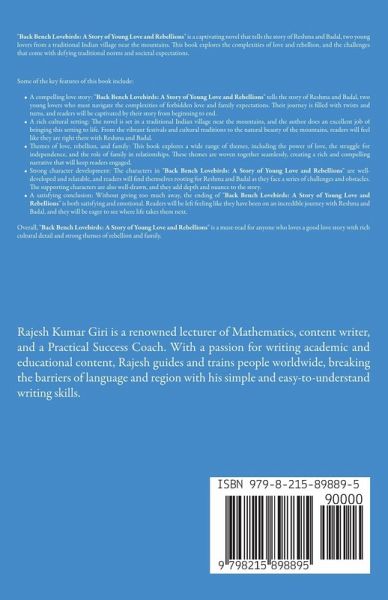 "Back Bench Lovebirds: A Story of Young Love and Rebellions" is a captivating novel that tells the story of Reshma and Badal, two young lovers from a traditional Indian village near the mountains. This book explores the complexities of love and rebellion, and the challenges that come with defying traditional norms and societal expectations. Some of the key features of this book include:A compelling love story: "Back Bench Lovebirds: A Story of Young Love and Rebellions" tells the story of Reshma and Badal, two young lovers who must navigate the complexities of forbidden love and family expectations. Their journey is filled with twists and turns, and readers will be captivated by their story from beginning to end. A rich cultural setting: The novel is set in a traditional Indian village near the mountains, and the author does an excellent job of bringing this setting to life. From the vibrant festivals and cultural traditions to the natural beauty of the mountains, readers will feel like they are right there with Reshma and Badal. Themes of love, rebellion, and family: This book explores a wide range of themes, including the power of love, the struggle for independence, and the role of family in relationships. These themes are woven together seamlessly, creating a rich and compelling narrative that will keep readers engaged. Strong character development: The characters in "Back Bench Lovebirds: A Story of Young Love and Rebellions" are well-developed and relatable, and readers will find themselves rooting for Reshma and Badal as they face a series of challenges and obstacles. The supporting characters are also well-drawn, and they add depth and nuance to the story. A satisfying conclusion: Without giving too much away, the ending of "Back Bench Lovebirds: A Story of Young Love and Rebellions" is both satisfying and emotional. Readers will be left feeling like they have been on an incredible journey with Reshma and Badal, and they will be eager to see where life takes them next. Overall, "Back Bench Lovebirds: A Story of Young Love and Rebellions" is a must-read for anyone who loves a good love story with rich cultural detail and strong themes of rebellion and family. Why is the book must read for all Back Bench Love Birds is a heartwarming story of young love and rebellion set in a traditional Indian village near a mountain valley. The book captures the essence of Indian culture and traditions, and how they influence the choices of young lovers. Reshma and Badal's love story is a tale of courage, sacrifice, and the power of love to overcome obstacles. The book touches upon themes of family, duty, and the conflict between tradition and modernity, making it a must-read for anyone interested in Indian culture. The story is relatable to anyone who has experienced the joys and challenges of falling in love, making it a must-read for all romantics. The book offers valuable life lessons on the importance of standing up for one's beliefs and the consequences of following one's heart. The vivid descriptions of village life, the mountains, and the city transport the reader to the world of Reshma and Badal, making the story come alive. The book is written in an engaging and accessible style, making it a perfect read for anyone looking for a heartwarming and inspiring love story.