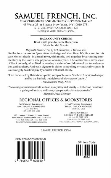 Play with Music / Music by Mel Marvin / 4m, 6f (34 characters) / Various sets. Similar in structure to Spoon River Anthology and Our Town, It's life - and in this case, violent death - in a small town, with music, tied together by a running commentary by the town's sole physician of many years. The author has a savvy sense of black comedy, all utilized in weaving a series of sordid tales of backwoods murder, and adultery. And each vignette is either compelling or caustically comic. It is a stra