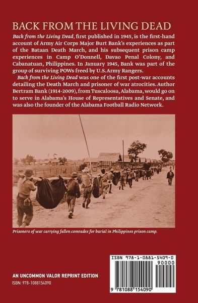 Back from the Living Dead, first published in 1945, is the first-hand account of Army Air Corps Major Burt Bank's experiences as part of the Bataan Death March and his subsequent prison camp experiences in Camp O'Donnell, Davao Penal Colony, and Cabanatuan, Philippines. In January 1945, Bank was part of the group of surviving POWs freed by U.S. Army Rangers. Back from the Living Dead was one of the first post-war accounts detailing the Death March and prisoner of war atrocities. Author Bertram Bank (1914-2009), from Tuscaloosa, Alabama, would go on to serve in Alabama's House of Representatives and Senate, and was also the founder of the Alabama Football Radio Network.