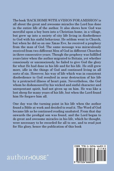 The book 'BACK HOME WITH A VISION FOR A MISSION' is all about the great and awesome miracles the Lord has done in the entire life of the author. It also shows how God was merciful upon a boy born into a Christian home, in a village, but grew up into a society of city life living in disobedience to God with his sinful behaviour. He seldom went to Church, but when he did so on one Xmas Eve, he received a prophecy from the man of God. The same message was miraculously received from two different Men of God in different Churches in three consecutive years. Though the prophecy was fulfilled years later when the author migrated to Britain, yet whether consciously or unconsciously, he failed to give God the glory for what He had done in his life and for his life. He still grew more, idle in the things of God and continued living in all sorts of sin. However, his way of life which was in consistent disobedience to God resulted in near destruction of his life by a protracted illness of heart pain. Nevertheless, the God whom he dishonoured by his wicked and sinful character and unrepentant spirit, had not given up on him. He was like a lost sheep for many years of his life, but when the Lord found him He forgave him all. One day was the turning point in his life when the author found a Bible at work and decided to read it. The Word of God became life as he continued reading unabated. From that day onwards the prodigal son was found, and the Lord began to do great and awesome miracles in his life, which he thought, were necessary to be recorded for all to see, and to read just for His glory, hence the publication of this book.