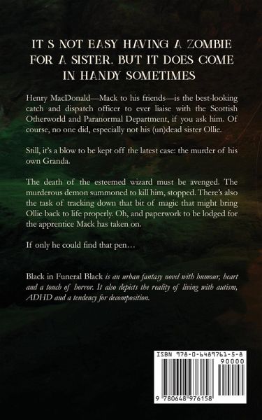 It's not easy having a zombie for a sister, but it does come in handy sometimes... Henry MacDonald-Mack to his friends-is the best-looking catch and dispatch officer to ever liaise with the Scottish Otherworld and Paranormal Department, if you ask him. Of course, no one did, especially not his (un)dead sister Ollie. Still, it's a blow to be kept off the latest case: the murder of his own Granda. The death of the esteemed wizard must be avenged. The murderous demon summoned to kill him, stopped. There's also the task of tracking down that bit of magic that might bring Ollie back to life properly. Oh, and paperwork to be lodged for the apprentice Mack has taken on. If only he could find that pen... Black in Funeral Black is an urban fantasy novel with humour, heart and a touch of horror. It also depicts the reality of living with autism, ADHD and a tendency for decomposition.