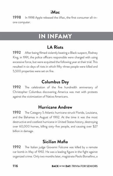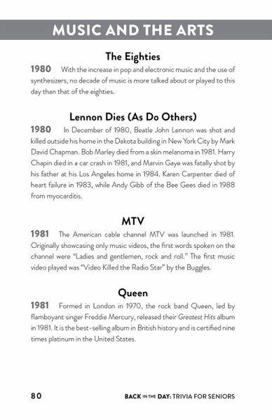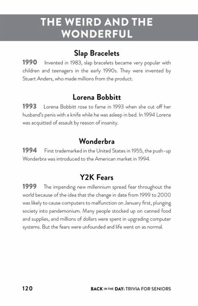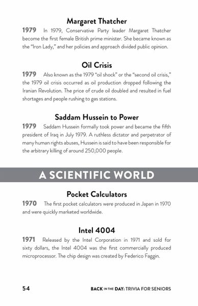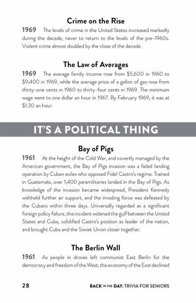 Exercise your mind and promote brain health with the ultimate collection of fascinating trivia facts for seniors. Are you ready to take a trip down memory lane, exercise your brain, and rediscover all the interesting facts from past generations? Then get ready to immerse yourself into this fun and captivating collection of trivia. You'll test just how much you remember from some of the biggest pop culture and historical moments, from the Golden Age to the modern era. This book has everything you need to know to train your brain while also having fun! Inside you'll discover the answer to questions like: When did bikinis and stilettos gain popularity? What year did the Berlin Wall fall? Who was the first person to land on the moon? How fast did Usain Bolt run in the 100 meters? And so much more! Plus, there's a short quiz at the end of each decade to test your memory, featuring additional fun facts not mentioned in the chapter. So get ready to enjoy a blast from the past.