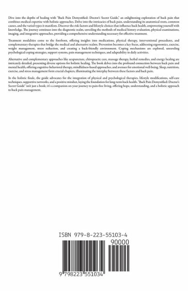 Dive into the depths of healing with "Back Pain Demystified: Doctor's Secret Guide," an enlightening exploration of back pain that combines medical expertise with holistic approaches. Delve into the intricacies of back pain, understanding its anatomical roots, common causes, and the varied types it manifests. Discover the risk factors and lifestyle choices that influence back health, empowering yourself with knowledge. The journey continues into the diagnostic realm, unveiling the methods of medical history evaluation, physical examinations, imaging, and integrative approaches, providing a comprehensive understanding necessary for effective treatment. Treatment modalities come to the forefront, offering insights into medications, physical therapy, interventional procedures, and complementary therapies that bridge the medical and alternative realms. Prevention becomes a key focus, addressing ergonomics, exercise, weight management, stress reduction, and creating a back-friendly environment. Coping mechanisms are explored, unraveling psychological coping strategies, support systems, pain management techniques, and adaptability in daily activities. Alternative and complementary approaches like acupuncture, chiropractic care, massage therapy, herbal remedies, and energy healing are intricately detailed, presenting diverse options for holistic healing. The book delves into the profound connection between back pain and mental health, offering cognitive-behavioral therapy, mindfulness-based approaches, and avenues for emotional well-being. Sleep, nutrition, exercise, and stress management form crucial chapters, illuminating the interplay between these factors and back pain. In the holistic finale, the guide advocates for the integration of physical and psychological therapies, lifestyle modifications, self-care techniques, supportive networks, and a positive mindset, laying the foundation for long-term back health. "Back Pain Demystified: Doctor's Secret Guide" isn't just a book; it's a companion on your journey to pain-free living, offering hope, understanding, and a holistic approach to back pain management.