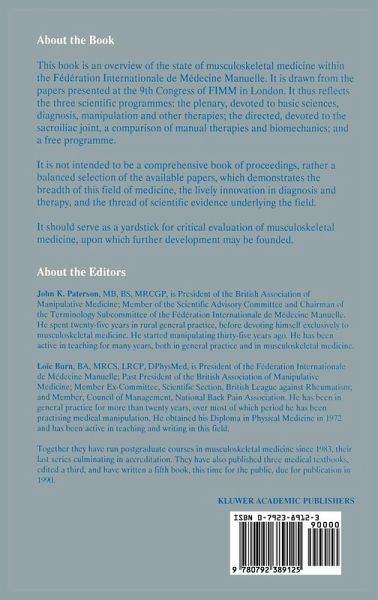 Plenary Papers.- 1 The peripheral modulation of nociceptive input.- 2 Intradiscal pressure changes and the clinician.- 3 Electromyography - its significance to the manipulator.- 4 The clinical testing of pain.- 5 The spinal modulation of pain.- 6 Principles and problems in clinical research in low back pain.- 7 Referred pain and tenderness.- 8 Basic case analysis.- 9 Manual therapy -1989.- 10 An osteopathic approach to manipulation.- 11 Low back pain of thoracolumbar origin.- 12 The Cyriax contribution to manipulation.- 13 Manipulation of the sacroiliac joint.- 14 The diagnosis and therapy of sacroiliac joint dysfunction utilizing manual medicine techniques, in particular the muscle energy technique by Mitchell.- 15 Injections in the lumbar area.- 16 Drug therapy.- 17 The causes of poor results of surgery in low back pain.- 18 Treatment of pain with electrical stimulation (TENS) and acupuncture.- 19 Hypnosis in musculoskeletal medicine.- Directed Papers.- 20 Comments on the evolution of the sacroiliac joint.- 21 Clinical aspects of sacroiliac function in walking.- 22 The sacroiliac lesion - does it exist?.- 23 Differential diagnosis of muscle tone in respect of inhibitory techniques.- 24 Practical approaches to the normalization of muscle tension.- 25 Metameric medicine and atlas therapy.- 26 The method of autotraction in manual medicine.- 27 The space truss as a model for cervical spine mechanics - a systems science concept.- 28 Anamnesis as diagnostic tool in musculoskeletal medicine.- 29 A new technique of proprioceptive re-education in manual medicine.- Free Papers.- 30 Cranial and visceral symptoms in mechanical pelvic dysfunction.- 31 A study of the contribution of pain to rotation of vertebrae in the aetiology and pathogenesis of lateral spinalcurvature.- 32 Pelvic dysfunction.- 33 Pyriformis muscle syndrome.- 34 Iliosacral lesion and the quadratus lumborum syndrome.- 35 The cervico-lumbar syndrome.- 36 Clinical application of the basic physical principles for the use of mobilization and manipulation.- 37 Non-inflammatory joint pain in rheumatoid arthritis: the diagnostic role of intra-articular anaesthesia in the understanding of brachiogenic shoulder pain.- 38 The foot and manual medicine.- 39 Frozen wrist: the contribution of thermography.- 40 The New Zealand Association of Musculo Skeletal Medicine: Postgraduate courses for doctors.- 41 The nature and significance of trigger points.- 42 Low back pain, manipulation and long-term outcome.- 43 The computerized documentation of clinical and manual results.- 44 Lumbar sciatica - comparison of results 10 years after surgical or conservative treatment.- 45 A study to evaluate the outcome of acute backache with drug therapy and manipulation.- 46 Dorso-lumbar junction: biomechanical significance of mamillaris processus and transversospinales muscles.- 47 Skin rolling in the treatment of chronic pain.- 48 The importance of patient selection and imaging techniques in the success of chemonucleolysis.- 49 Radiofrequency denervation of the zygapophyseal joint nerve supply.- 50 Manipulative medicine and sports injuries.- 51 T3 syndrome.- 52 Radiographic signs of the function of the intrinsic muscles of the cervical spine.- 53 Radio-functional analysis of the cervical region of the spinal column according to Arlen in post-traumatic syndrome.- 54 Therapy of the atlas compared with traditional manipulation in sacroiliac dysfunction.- 55 Atlas therapy and neuromuscular diseases.