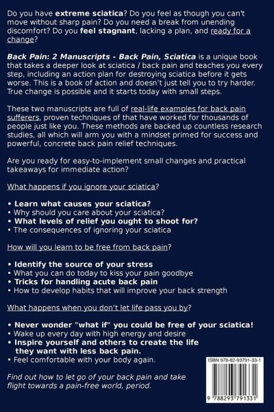 Do you have extreme sciatica? Do you feel as though you can't move without sharp pain? Do you need a break from unending discomfort? Do you feel stagnant, lacking a plan, and ready for a change? Are you terrified of ending up old having wasted years of your life with sciatica? If you keep doing what you've always done, your problem will only get worse. Is this working for you? Back Pain: Back Pain, Sciatica is a unique book that takes a deeper look at sciatica/back pain and teaches you every step, including an action plan for destroying sciatica before it gets worse. This is a book of action and doesn't just tell you to try harder. True change is possible and it starts today with small steps. These two manuscripts are full of real-life examples for back pain sufferers, proven techniques that have worked for thousands of people just like you. These methods are backed up countless research studies, all of which will arm you with a mindset primed for success and powerful, concrete back pain relief techniques. You'll walk away knowing exactly what to do to help yourself. This isn't a book of endless analyses that help no one. Are you ready for easy-to-implement small changes and practical takeaways for immediate action? What happens if you ignore your sciatica? ¿ Learn what causes your sciatica? ¿ Why should you care about your sciatica? ¿ What levels of relief you ought to shoot for? ¿ The consequences of ignoring your sciatica How will you learn to be free from back pain? ¿ Identify the source of your stress ¿ What you can do today to kiss your pain goodbye ¿ Tricks for handling acute back pain ¿ How to develop habits that will improve your back strength What happens when you don't let life pass you by? ¿ Never wonder "what if" you could be free of your sciatica! ¿ Wake up every day with high energy and desire ¿ Inspire yourself and others to create the life they want with less back pain. ¿ Feel comfortable with your body again. Find out how to let go of your back pain and take flight towards a pain-free world, period. Shed your pain and learn how to take control of your body right now! Try Back Pain: 2 Manuscripts - Back Pain, Sciatica today by clicking the BUY NOW button at the top right of this page! P.S. You'll be able to notice a difference within 24 hours.