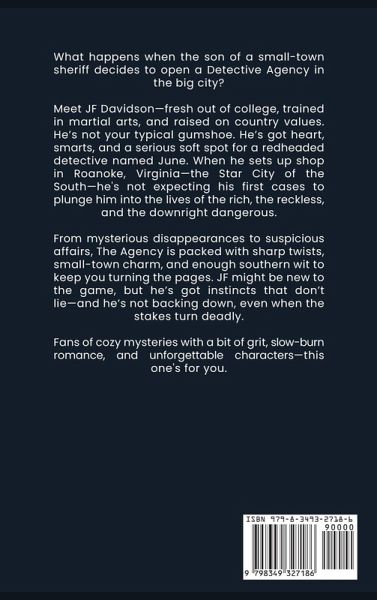 In The Agency, book VII of the Back Road Mysteries series, James Francis (JF) Davidson, son of former Craig County sheriff Clifford Davidson, embarks on a new adventure as he opens his own private detective agency in the heart of Roanoke, Virginia. After growing up surrounded by law enforcement, JF is ready to carve his own path. However, things are far from simple in the Star City of the South. From the moment JF steps into his new life as a detective, he encounters a mix of business and personal challenges. He starts his training under the watchful eye of June Johnson, an experienced detective with a sharp mind and a striking presence. As they work together to solve various cases, including a high-profile missing persons investigation, JF realizes that not everything is as it seems. The cases soon become more complicated, leading him into a world of deceit, hidden motives, and dark secrets. But nothing can shake his determination to uncover the truth. With its blend of small-town charm and nail-biting suspense, The Agency takes readers deep into the heart of Roanoke, where family ties, old secrets, and a dash of romance intertwine to create an unforgettable mystery. From the tension-filled investigation to the unexpected twists and turns, this story will keep you guessing until the very end. Will JF succeed in unraveling the truth behind the mysteries that plague Roanoke? Or will the dangers lurking in the shadows prove to be more than he can handle?