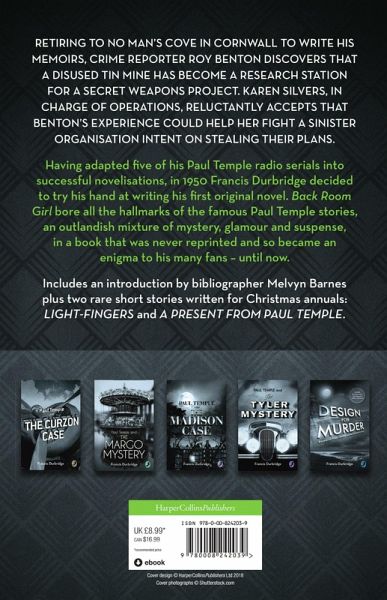 Having adapted five of his Paul Temple radio serials into successful novelisations, in 1950 Francis Durbridge decided to try his hand at writing his first original novel. Back Room Girl bore all the hallmarks of the famous Paul Temple stories, an outlandish mixture of mystery, glamour and suspense, in a book that was never reprinted and so became an enigma to his many fans - until now.