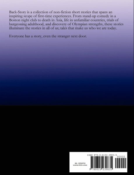 Back-Story: First Time Tales by the Stranger Next Door is a collection of non-fiction short stories that spans an inspiring scope of first-time experiences. From stand-up comedy in a Boston night club to death in Asia, life in unfamiliar countries, trials of burgeoning adulthood, and discovery of Olympian strengths, these stories illuminate the stories in all of us; tales that make us who we are today. Everyone has a story, even the stranger next door.