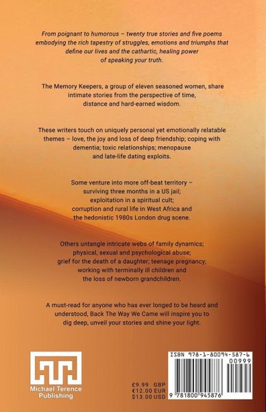 From poignant to humorous - twenty true stories and five poems embodying the rich tapestry of struggles, emotions and triumphs that define our lives and the cathartic, healing power of speaking your truth.¿ The Memory Keepers, a group of eleven seasoned women, share intimate stories from the perspective of time, distance and hard-earned wisdom. These writers touch on uniquely personal yet emotionally relatable themes - love, the joy and loss of deep friendship; coping with dementia; toxic relationships; menopause and late-life dating exploits. Some venture into more off-beat territory - surviving three months in a US jail; exploitation in a spiritual cult; corruption and rural life in West Africa and the hedonistic 1980s London drug scene. Others untangle intricate webs of family dynamics; physical, sexual and psychological abuse; grief for the death of a daughter; teenage pregnancy; working with terminally ill children and the loss of newborn grandchildren. A must-read for anyone who has ever longed to be heard and understood, Back The Way We Came will inspire you to dig deep, unveil your stories and shine your light.