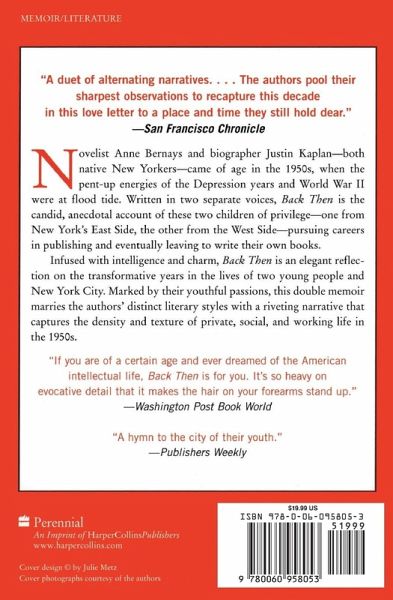 Novelist Anne Bernays and biographer Justin Kaplan -- both native New Yorkers -- came of age in the 1950s, when the pent-up energies of the Depression years and World War II were at flood tide. Written in two separate voices, Back Then is thecandid, anecdotal account of these two children of privilege -- one from New York's East Side, the other from the West Side -- pursuing careers in publishing and eventually leaving to write their own books. Infused with intelligence and charm, Back Then is an elegant reflection on the transformative years in the lives of two young people and New York City. Marked by their youthful passions, this double memoir marries the authors' distinct literary styles with a riveting narrative that captures the density and texture of private, social, and working life in the 1950s.