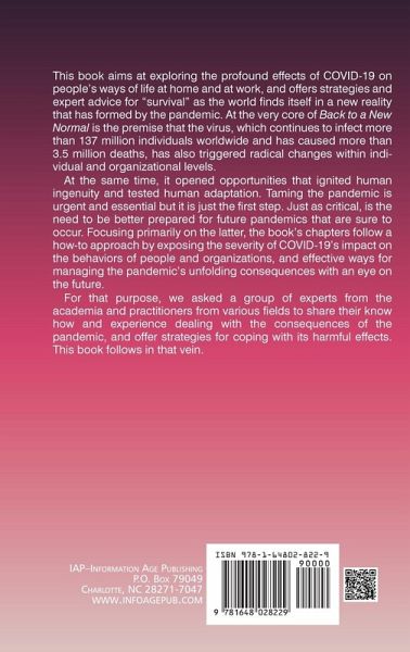 This book aims at exploring the profound effects of Covid-19 on people's ways of life at home and at work, and offers strategies and expert advice for 'survival' as the world finds itself in a new reality that has formed by the pandemic. At the very core of Back to a New Normal is the premise that the virus, which continues to infect more than 137 million individuals worldwide and has caused millions of deaths, has also triggered radical changes within individual and organizational levels. At the same time, it opened opportunities that ignited human ingenuity and tested human adaptation. Taming the pandemic is urgent and essential but it is just the first step. Just as critical, is the need to be better prepared for future pandemics that are sure to occur. Focusing primarily on the latter, the book's chapters follow a how to approach by exposing the severity of Covid-19's impact on the behaviors of people and organizations, and effective ways for managing the pandemic's unfolding consequences with an eye on the future. For that purpose, we asked a group of experts from the academia and practitioners from various fields to share their know how and experience dealing with the consequences of the pandemic, and offer strategies for coping with its harmful effects. This book follows in that vein.