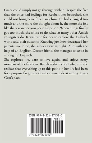 Grace could simply not go through with it. Despite the fact that she once had feelings for Reuben, her betrothed, she could not bring herself to marry him. He had changed too much and the more she thought about it, the more she felt like she was in her own personal prison. When things finally got too much, she chose to do what so many other Amish youngsters do. It was time for her to explore the Englisch world and their customs. Knowing just how devastated her parents would be, she sneaks away at night. And with the help of an Englisch Doctor friend, she manages to settle in among the Englisch. She explores life, dare to love again, and enjoys every moment of her freedom. But then she meets Lydia, and she realizes that everything up to this point in her life had been for a purpose far greater than her own understanding. It was Gott's plan.