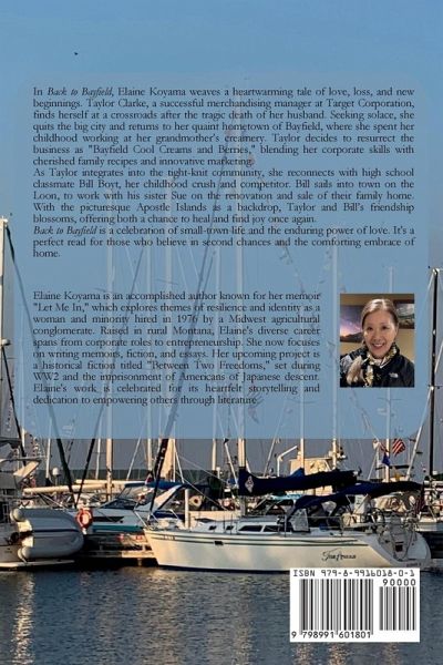 In Back to Bayfield, Elaine Koyama paints a poignant tale of love, loss, and healing in a small lakeside town. After the tragic death of her husband, Taylor Clarke leaves behind her corporate life in Minneapolis and returns to Bayfield, Wisconsin, where she grew up. She decides to revive her grandmother's creamery and opens "Bayfield Cool Creams and Berries," combining her business acumen with nostalgic family recipes. As Taylor rebuilds her life, she rekindles old friendships and Taylor's older brother Kent remains a quiet presence, supportive yet immersed in running the family's berry farm. Bill Boyt, a key figure in Taylor's past, unexpectedly returns to Bayfield, bringing with him the complications of a shared history. Once Taylor's childhood rival and high school crush, Bill spent years away from his hometown, finding success in Chicago. Recently divorced, Bill returns to help his sister Sue manage family affairs, particularly the rundown mansion their parents left behind. His reappearance stirs old emotions in Taylor, who must confront the unresolved feelings from their competitive school days. Bill's presence in Bayfield adds a layer of complexity to Taylor's life. As he works on the family home and on his sailboat, Bill finds himself drawn back into the rhythms of small-town life, questioning the decisions he made to leave. He and Taylor, despite their past tensions, develop a tentative friendship that begins to hint at the possibility of something more. Sue Boyt, Bill's sister, plays a vital role in the community as the local high school guidance counselor and city mayor. She also becomes a close confidante for Taylor, adding a layer of humor and warmth to the narrative. Sue, busy organizing town events like the Memorial Day dance and the 4th of July festivities, becomes a bridge between the characters, particularly when it comes to smoothing over tensions between Bill and Taylor. As the summer progresses, Taylor, Bill, and Jim find themselves navigating a complicated mix of old wounds and new beginnings. The picturesque setting of the Apostle Islands provides a serene backdrop for Taylor's journey toward healing and rediscovery. With Bayfield's tight-knit community supporting her, Taylor is forced to make a choice between her work and the rekindling of unresolved feelings for Bill. Back to Bayfield is a heartwarming and layered romance about finding solace in the familiar, reconciling with the past, and opening oneself up to new possibilities. It captures the nuances of small-town life while exploring the complex dynamics of love, loss, and the journey back to happiness.