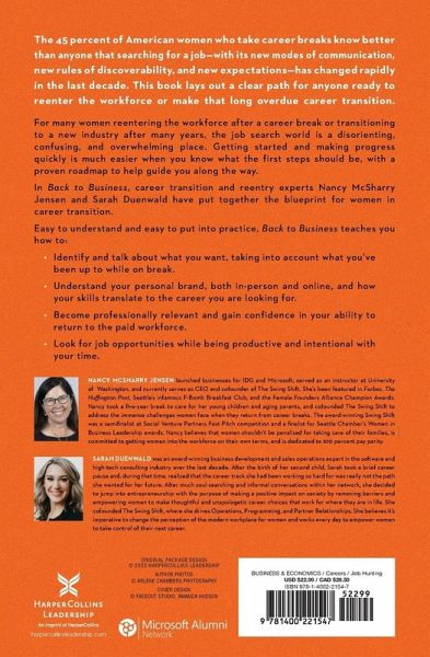 Back to Business makes returning to the workforce accessible for anyone who believes that finding a decent job after taking a career break is impossible. When on the hunt for a job, make sure your LinkedIn profile is just as polished and updated as your resume. If you aren't getting responses from recruiters, chances are your profile is missing pertinent keywords that bots aren't selecting. In addition, dress codes have changed too, so you'll need to know new technologies such as Slack and Google+ Hangouts. If you have no idea what any of this means, YOU'RE NOT ALONE. You're one of the forty-five percent of women who, after taking a career break, quickly discovered that the job search has changed rapidly in the last decade. With new modes of communication, rules of discoverability and expectations, this book lays out a clear path for anyone ready to re-enter the workforce. Getting started is much easier when you know what the first step should be. In Back to Business, career coaching and re-entry experts Nancy McSharry Jensen and Sarah Duenwald, have put together a guide for women returning to the workplace. Practical and easy to understand, Back to Business teaches you how to: * Identify and talk about what you want. * Understand your personal brand and how your skills translate to your new career. * Become professionally relevant and gain confidence in returning to the workforce. * Look for job opportunities while being productive and intentional with your time. Nancy and Sarah understand through first-hand experience the anxiety of returning to work. They have helped hundreds of women facing the job search process to overcome the anxiety of what is often overwhelming life change.