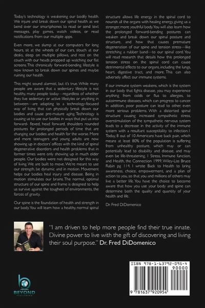 Today's technology is weakening our bodily health. We injure and break down our spinal health as we bend over our smartphones to read or send text messages, play games, watch videos, or read notifications from our multiple apps. Even more, we slump at our computers for long hours, sit at the wheels of our cars, slouch at our desks, sleep on multiple pillows, and rest on the couch with our heads propped up watching our flat screens. This chronically forward-bending lifestyle is now known to break down our spines and maybe ruining our health. This might sound alarmist, but it's true. While many people are aware that a sedentary lifestyle is not healthy, many people today-regardless of whether they live sedentary or active lifestyles or anything in between-are adapting to a technology-focused way of living that can physically break down our bodies and cause pre-mature aging. Technology is causing us to use our bodies in ways that put us into forward-flexed, head forward, shoulders rounded postures for prolonged periods of time that are changing our bodies and health for the worse. More and more teenagers and young adults are now showing up in doctors' offices with the kind of spinal degenerative disorders and health problems that in former times were only showing up in much older people. Our bodies were not designed for this way of living. We are built to move. We're meant to use our strength, be dynamic and in motion. Movement helps our bodies heal injury and disease. Being in motion stimulates our brains. The normal, optimal structure of our spine and frame is designed to help us survive against the toughest of environments, the forces of gravity. Our spine is the foundation of health and strength in our body. You will learn how a healthy, normal spinal structure allows life energy in the spinal cord to nourish all the organs with healing energy, giving us a stronger, more youthful body. You will also learn how the prolonged forward-bending postures can weaken and break down our spinal posture and structure, and how that causes premature degeneration of our spine and tension stress-like stretching a rubber band-to our spinal cord. You will read research that details how this prolonged tension stress on the spinal cord can cause detrimental effects to our organs, including the lungs, heart, digestive tract, and more. This can also adversely affect our immune systems. If our immune system weakens, which is the system in our body that fights disease, you may experience anything from colds or flus to allergies, to autoimmune diseases, which can progress to cancer. In addition, poor posture can lead to other, even more serious problems. With a distorted spinal structure causing increased sympathetic stress, overstimulation of the sympathetic nervous system leads to a decrease in the activity of the immune system with a resultant susceptibility to infection.1 Today, 8 out of 10 Americans have back pain, which means at least 80% of the population is suffering from unhealthy posture, which may or can potentially lead to disability and disease, and may even be life-threatening. I wrote Back to Health to bring awareness, choice, empowerment, and a plan of action to you, so that you and millions of others may live a better life. You have the choice to become aware that how you use your body and spine can determine both the quality and quantity of your health and life.