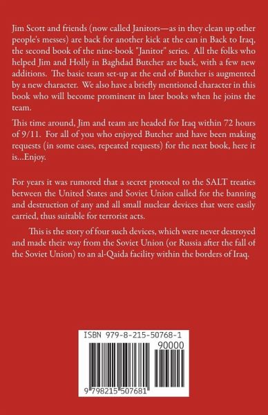 Jim Scott and friends (now called Janitors-as in they clean up other people's messes) are back for another kick at the can in Back to Iraq, the second book of the nine-book "Janitor" series. All the folks who helped Jim and Holly in Baghdad Butcher are back, with a few new additions. The basic team set-up at the end of Butcher is augmented by a new character. We also have a briefly mentioned character in this book who will become prominent in later books when he joins the team. This time around, Jim and team are headed for Iraq within 72 hours of 9/11. For all of you who enjoyed Butcher and have been making requests (in some cases, repeated requests) for the next book, here it is…Enjoy. For years it was rumored that a secret protocol to the SALT treaties between the United States and Soviet Union called for the banning and destruction of any and all small nuclear devices that were easily carried, thus suitable for terrorist acts. This is the story of four such devices, which were never destroyed and made their way from the Soviet Union (or Russia after the fall of the Soviet Union) to an al-Qaida facility within the borders of Iraq.