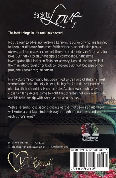The best things in life are unexpected. No stranger to adversity, Antonia Larson is a survivor who has learned to keep her distance from men. With her ex-husband's dangerous obsession looming as a constant threat, she definitely wasn't looking for love. But thanks to an unanticipated coincidence, handsome investigator Niall McLaren found her anyway. Now all she knows is if the man who brought her back to love ends up hurt because of her past, she'll never forgive herself. Niall McLaren's company has been hired to trail one of Britain's most wanted criminals. Unlucky in love, falling for Antonia wasn't part of his plan but their chemistry was undeniable. As the new couple grows closer, chilling details come to light that threaten not only Niall's job and his relationship with Antonia, but his life. With a serendipitous second chance at love that seems so real, will Antonia and Niall find their way through the darkness and back to each other's arms?