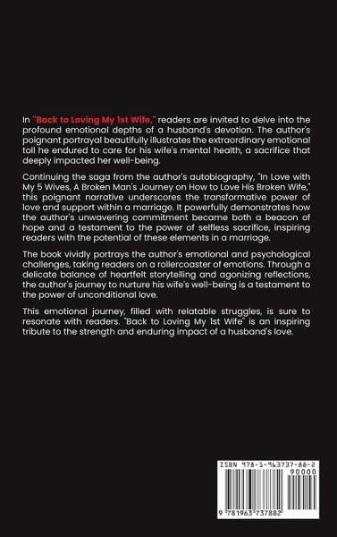 In "Back to Loving My 1st Wife," readers are invited to delve into the profound emotional depths of a husband's devotion. The author's poignant portrayal beautifully illustrates the extraordinary emotional toll he endured to care for his wife's mental health, a sacrifice that deeply impacted her well-being. Continuing the saga from the author's award-winning autobiography, "In Love with My 5 Wives: A Broken Man's Journey on How to Love His Broken Wife," this poignant narrative underscores the transformative power of love and support within a marriage. It powerfully demonstrates how the author's unwavering commitment became both a beacon of hope and a testament to the power of selfless sacrifice, inspiring men with the potential of these elements in a marriage. The book vividly portrays the author's emotional and psychological challenges, taking readers on a rollercoaster of emotions. Through a delicate balance of heartfelt storytelling and agonizing reflections, "Back to Loving My 1st Wife" is an inspiring tribute to the strength and enduring impact of a husband's love.