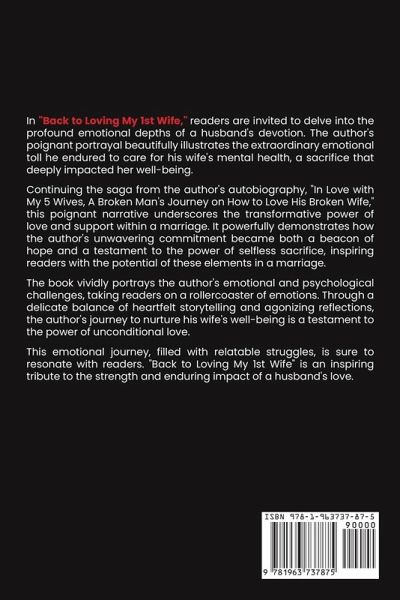 In "Back to Loving My 1st Wife," readers are invited to delve into the profound emotional depths of a husband's devotion. The author's poignant portrayal beautifully illustrates the extraordinary emotional toll he endured to care for his wife's mental health, a sacrifice that deeply impacted her well-being. Continuing the saga from the author's award-winning autobiography, "In Love with My 5 Wives: A Broken Man's Journey on How to Love His Broken Wife," this poignant narrative underscores the transformative power of love and support within a marriage. It powerfully demonstrates how the author's unwavering commitment became both a beacon of hope and a testament to the power of selfless sacrifice, inspiring men with the potential of these elements in a marriage. The book vividly portrays the author's emotional and psychological challenges, taking readers on a rollercoaster of emotions. Through a delicate balance of heartfelt storytelling and agonizing reflections, "Back to Loving My 1st Wife" is an inspiring tribute to the strength and enduring impact of a husband's love.