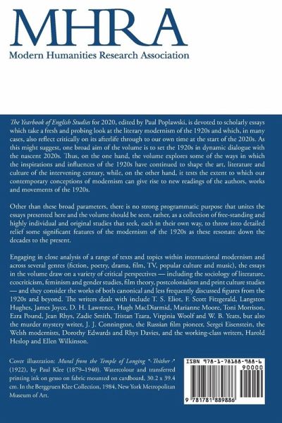 The Yearbook of English Studies for 2020, edited by Paul Poplawski, is devoted to scholarly essays which take a fresh and probing look at the literary modernism of the 1920s and which, in many cases, also reflect critically on its afterlife through to our own time at the start of the 2020s. As this might suggest, one broad aim of the volume is to set the 1920s in dynamic dialogue with the nascent 2020s. Thus, on the one hand, the volume explores some of the ways in which the inspirations and influences of the 1920s have continued to shape the art, literature and culture of the intervening century, while, on the other hand, it tests the extent to which our contemporary conceptions of modernism can give rise to new readings of the authors, works and movements of the 1920s. Other than these broad parameters, there is no strong programmatic purpose that unites the essays presented here and the volume should be seen, rather, as a collection of free-standing and highly individual and original studies that seek, each in their own way, to throw into detailed relief some significant features of the modernism of the 1920s as these resonate down the decades to the present. Engaging in close analysis of a range of texts and topics within international modernism and across several genres (fiction, poetry, drama, film, TV, popular culture and music), the essays in the volume draw on a variety of critical perspectives — including the sociology of literature, ecocriticism, feminism and gender studies, film theory, postcolonialism and print culture studies — and they consider the works of both canonical and less frequently discussed figures from the 1920s and beyond. The writers dealt with include T. S. Eliot, F. Scott Fitzgerald, Langston Hughes, James Joyce, D. H. Lawrence, Hugh MacDiarmid, Marianne Moore, Toni Morrison, Ezra Pound, Jean Rhys, Zadie Smith, Tristan Tzara, Virginia Woolf and W. B. Yeats, but also the murder mystery writer, J. J. Connington, the Russian film pioneer, Sergei Eisenstein, the Welsh modernists, Dorothy Edwards and Rhys Davies, and the working-class writers, Harold Heslop and Ellen Wilkinson.